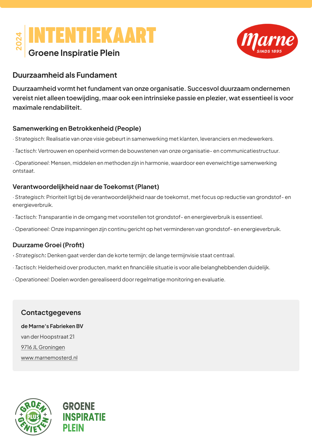 Iedere partner binnen het Groene Inspiratie Plein ondertekent een Intentiekaart en ontvangt vervolgens een Certificaat. Deze Intentiekaart vormt de basis voor deelname en reflecteert de duurzame ambitie van een organisatie.